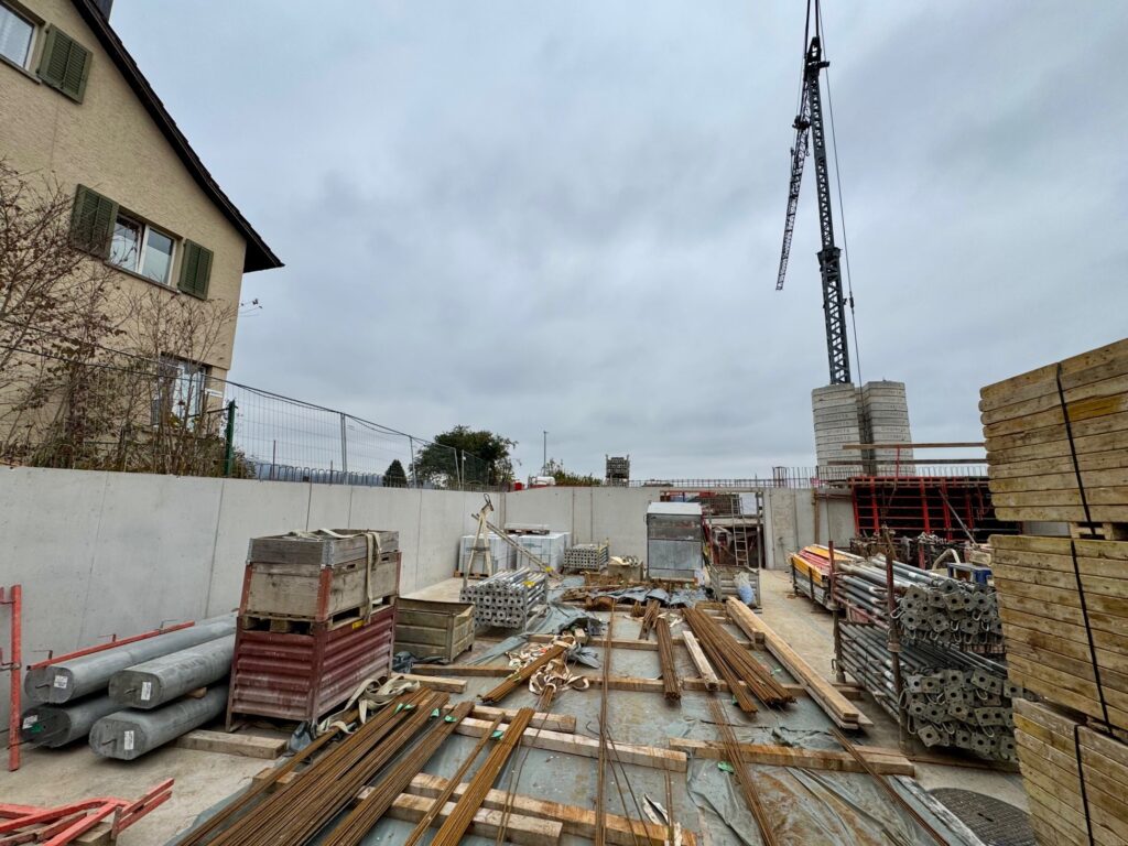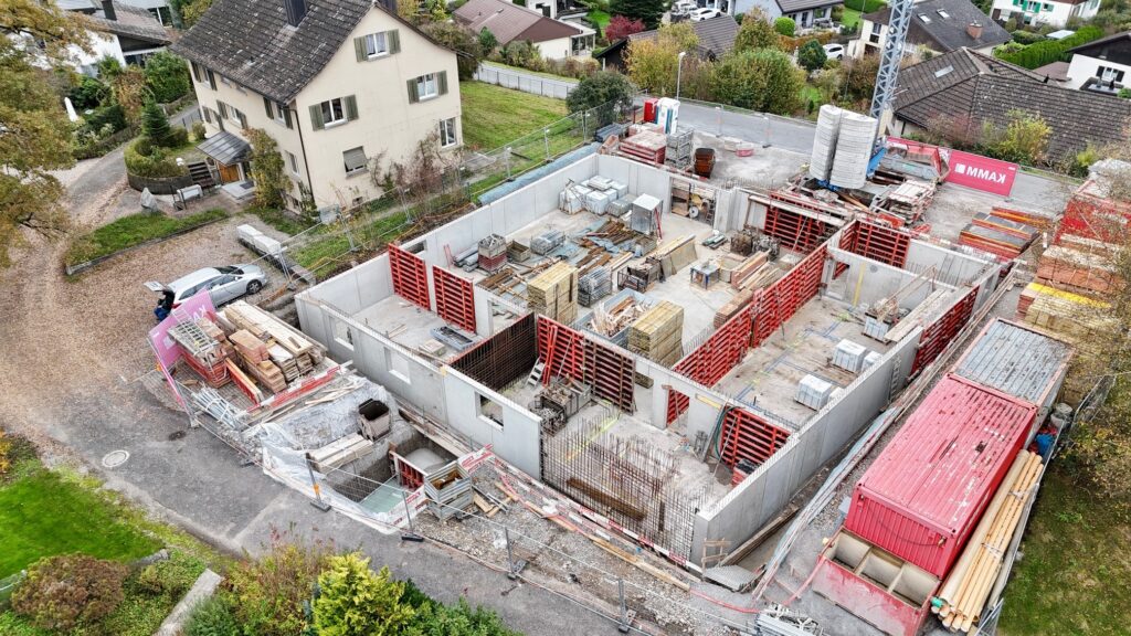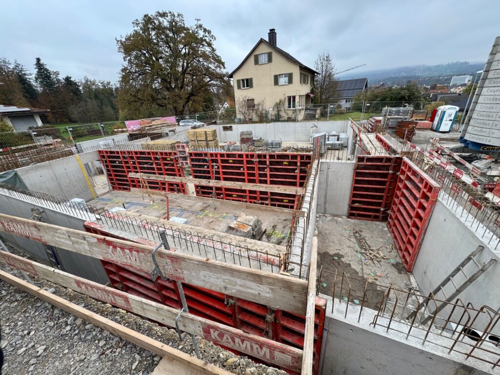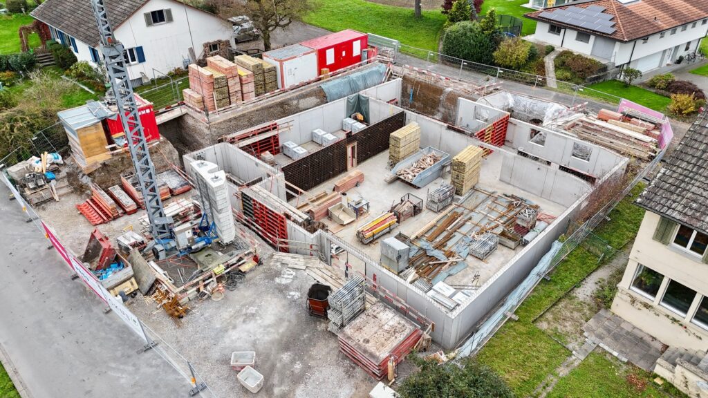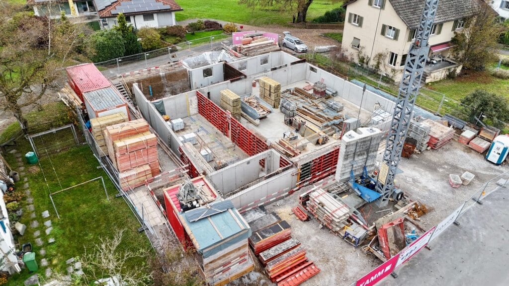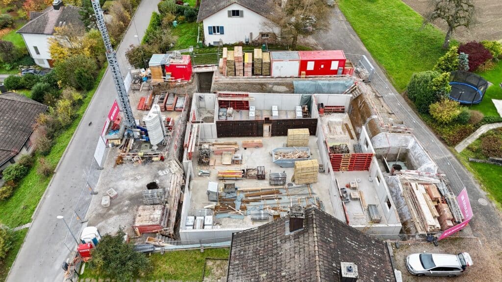 Meilensteine:  Abriss - Aushub - Bodenplatte - Aufrichte - 200 Tage